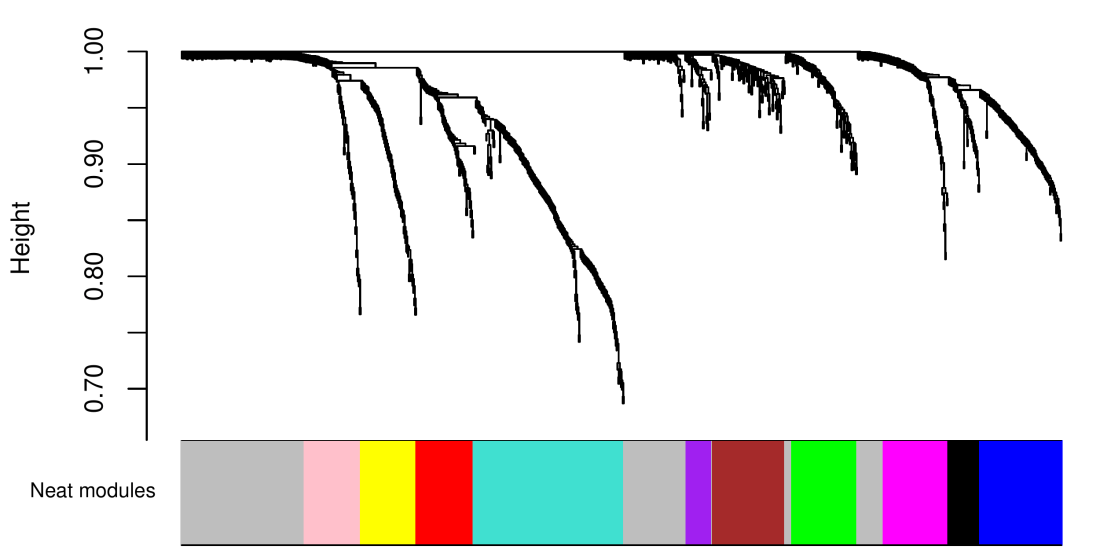 I get asked a lot why there is often an apparent disagreement between a clustering tree and module colors. In the plot above, some colors are split into a few blocks, colors sometimes overlap, it’s hard to figure out where a module begins and where it ends. People would rather see colors neatly arranged into blocks that correspond to branches, something like this: