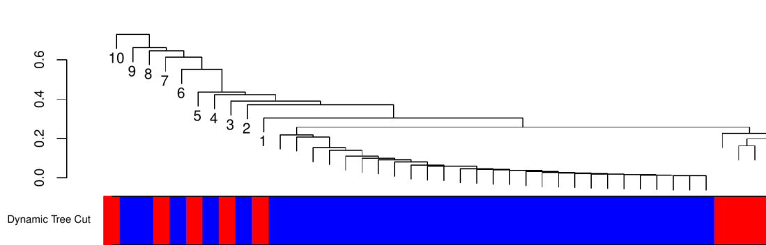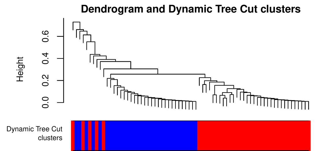This post is about Dynamic Tree Cut, the method used, together with hierarchical clustering, to identify modules (clusters) in WGCNA. To put this post in context, in WGCNA, through several steps, one constructs a variable-variable similarity matrix which is then used for clustering. (The clustering similarity is usually the Topological Overlap Matrix, TOM, but it is not a requirement). The similarity is then turned into a dissimilarity where higher numbers mean more dissimilar (distant) variables. The dissimilarity is used as input to a clustering method, which in WGCNA is the above-mentioned hierarchical clustering and Dynamic Tree Cut. The hierarchical clustering produces a structure called the dendrogram or clustering tree, and Dynamic Tree Cut identifies clusters as branches in the clustering tree. The clustering tree and the module labels are visualized together, as in the plot below.