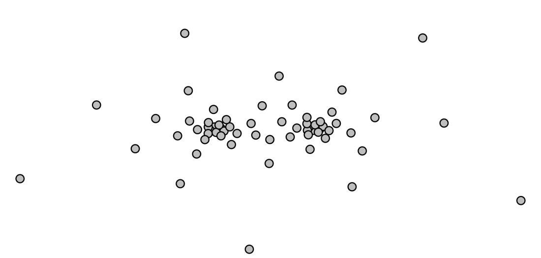 Although I wouldn’t bet my life on there being no bugs in Dynamic Tree Cut, this is most certainly a feature, or perhaps more accurately, it simply reflects a limitation of the dendrogram as a means of visualizing similarities of a large number of objects rather than something specific to Dynamic Tree Cut. Let me explain what I mean on a simple example. Look at the points in this figure: