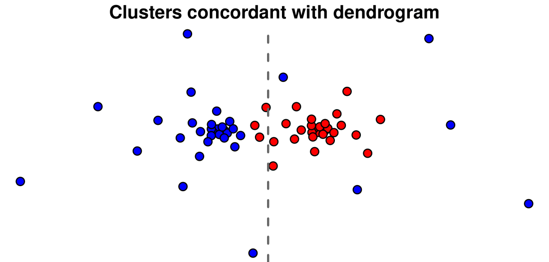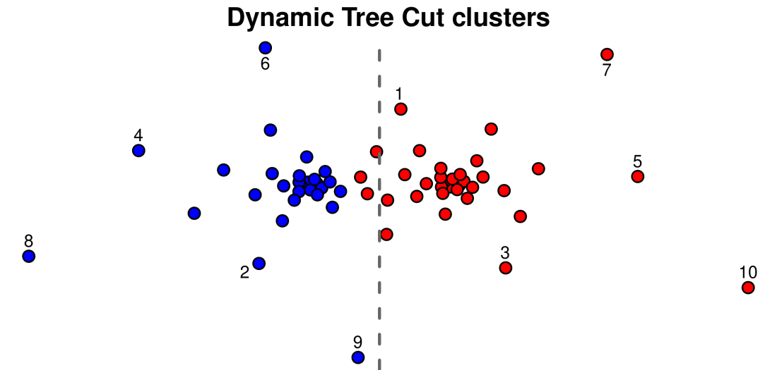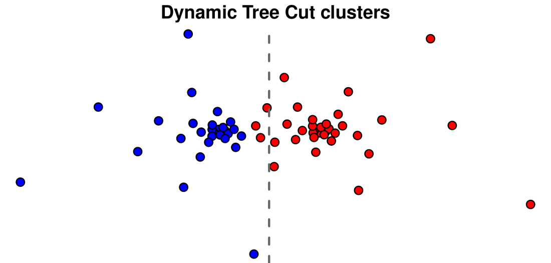 The outlying points around the red cluster are now colored blue, which makes very little sense. So there you have it: once two clusters merge on the dendrogram, any points that are merged above that may belong to either of the two clusters, and won’t form contiguous blocks of colors like the branches do. This also means that such outlying points cannot be assigned to clusters just based on the dendrogram; one needs the dissimilarity matrix to assign each point to its nearest cluster. This is what Dynamic Tree Cut does (at least in its default, “hybrid” form) and it’s why the colors under the dendrogram are correct, even if they look perhaps a bit messy. After all, data analysis is not a beauty contest!